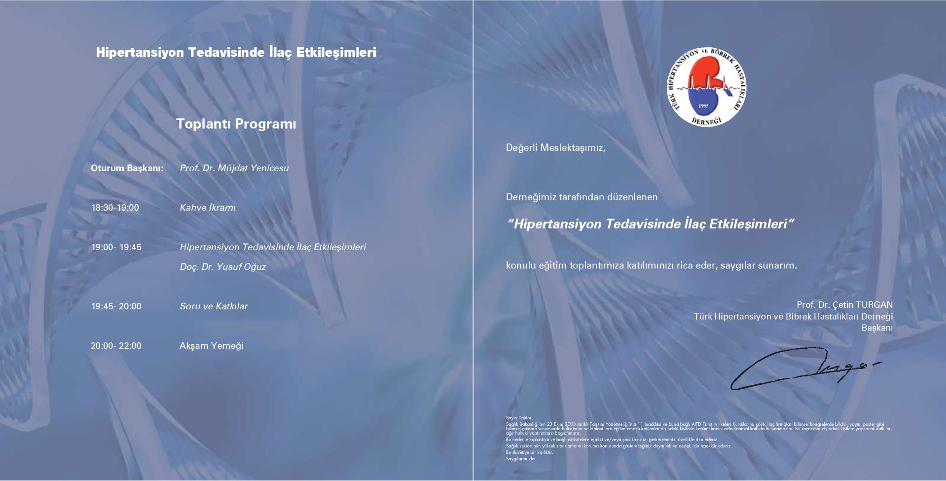 Türk Hipertansiyon ve Böbrek Hastalıkları Derneği"nce 30 Kasım 2007 tarihinde Ankara Hilton Otel"de düzenlenecek eğitim toplantısının programı açıklandı. "Hipertansiyon Tedavisinde İlaç Etkileşimleri" başlıklı toplantıda örnek vakalar ve konuyla ilgili güncel bilgiler sunulacaktır.